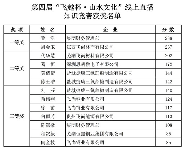 1月13日晚,飞尚集团第四届“飞越杯·山(shān)水文(wén)化”線(xiàn)上直播知识竞赛正式结束。根据竞赛规则,统计所有(yǒu)参赛者的最终得分(fēn),飞尚集团财務(wù)管理(lǐ)部黎浩、江西飞尚林产(chǎn)有(yǒu)限公(gōng)司周金玉分(fēn)别以238分(fēn)、237分(fēn)的成绩获得一等奖,芜湖(hú)飞尚材料有(yǒu)限公(gōng)司获得最佳组织奖。