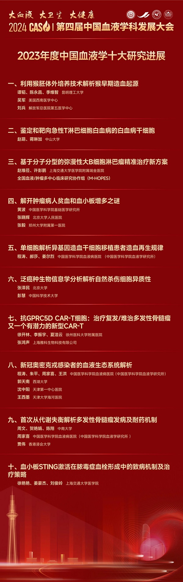 “中(zhōng)國(guó)血液學(xué)十大研究进展”遴选活动由中(zhōng)國(guó)血液學(xué)科(kē)发展大会发起,自2020年开始,至今已成功举办(bàn)四届,旨在记录、展示和宣传我國(guó)血液學(xué)研究领域的重大科(kē)學(xué)进展和标志(zhì)性成果,展现我國(guó)血液學(xué)研究实力和學(xué)术水平,激励血液學(xué)领域医(yī)师和广大科(kē)技(jì )工(gōng)作(zuò)者进一步勇担使命、追求卓越,促进公(gōng)众理(lǐ)解、关心和支持血液學(xué)研究,在全社会营造良好的科(kē)學(xué)氛围。