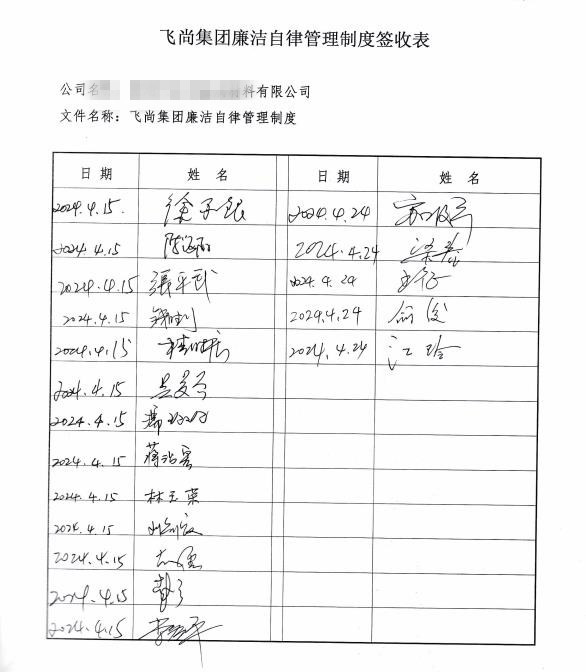 三是强化威慑监督。為(wèi)深入推进廉洁文(wén)化建设,畅通监督渠道,有(yǒu)效约束干部员工(gōng)坚持原则、恪守规矩,严格按照党纪國(guó)法办(bàn)事,清清白白做人,老老实实做事,营造风清气正的企业文(wén)化生态,集团和各成员企业鼓励员工(gōng)积极投诉、举报廉洁自律违纪行為(wèi),并将投诉、举报渠道和方式写入《廉洁自律管理(lǐ)制度》中(zhōng)。芜湖(hú)飞尚材料有(yǒu)限公(gōng)司通过设立投诉举报箱,多(duō)渠道畅通投诉举报方式。