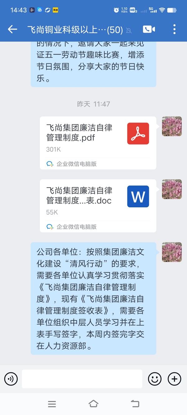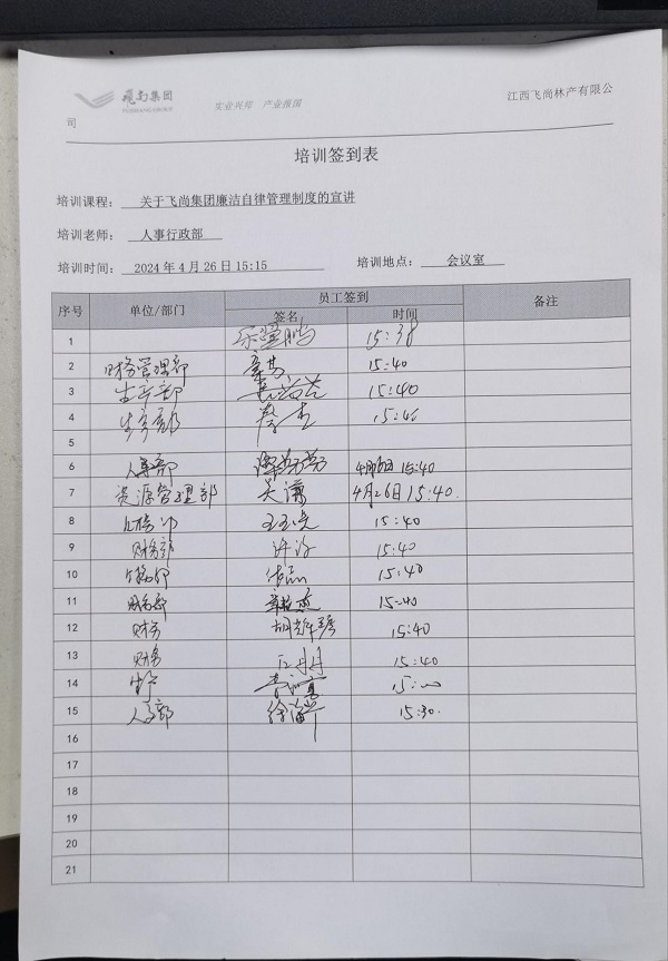 《飞尚集团廉洁自律管理(lǐ)制度》发布后,各成员企业相继出台本企业廉洁自律管理(lǐ)制度和各项管理(lǐ)规定,并通过微信工(gōng)作(zuò)群广泛宣传,不断健全员工(gōng)参与机制,充分(fēn)发挥员工(gōng)的积极性、创造性,夯实廉洁文(wén)化建设的群众基础。江西飞尚林产(chǎn)有(yǒu)限公(gōng)司通过座谈会进行深入宣贯,盐城捷康三氯蔗糖制造有(yǒu)限公(gōng)司打造了廉洁文(wén)化長(cháng)廊,拓宽了宣贯渠道和方式。